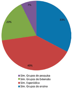 Primeiramente, a Regiao Sudeste é a que concentra também o maior número de instituiçoes de ensino, especialmente universidades, e que tendem a ser boas opçoes para parceria para a concepçao ou manutençao de espaços de divulgaçao científica. Além disso, é a regiao de maior desenvolvimento econômico, científico e tecnológico do país. A presença de maior número de profissionais ligados à Ciência oportuniza o envolvimento de parte deles ou é um fator de pressao de entidades governamentais para que espaços sejam construídos para disseminaçao da ciência para a populaçao. O número de centros/museus também acompanha algumas das características próprias de cada regiao, como extensao territorial. De acordo com o Instituto Brasileiro de Geografia e Estatística (IBGE),34 a Regiao Sul possui aproximadamente 577.000 km2, enquanto que a Regiao Norte chega a quase 3,9 milhoes de km2. Somam-se a isso as dificuldades de acesso em muitas partes, especialmente do norte do país, quando se tornam necessários alguns dias de viagem em diferentes sistemas de transporte para chegar a certas localidades. Há de se ressaltar, no entanto, que apesar de ser a área com o menor número de centros/museus de ciências, muitas açoes de divulgaçao científica sao realizadas na Regiao Norte nas formas de feiras de ciências e mostras culturais.35-37 Os relatos das dificuldades empreendidas para levantar recursos e chegar a locais longínquos com dias de viagem e sem infraestrutura de centros/museus de ciências torna a atividade de divulgaçao científica dependente do comprometimento de estudantes, docentes universitários e poder público.35 A interaçao com a universidade atrai a atençao dos responsáveis pelos museus/centros de ciências (Figura 4). Dos que responderam ao questionário, 55 possuem convênio com universidade, sendo que 27% é com grupos de extensao, 22% com pesquisadores, 5% com grupos de ensino e para 14% a interaçao é apenas esporádica.
