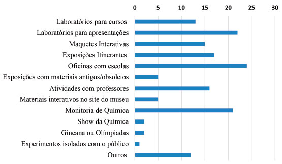 Os motivos apresentados pelos participantes desta pesquisa sao semelhantes aos relatados na literatura.12 A caracterizaçao da área de Química como sendo predominantemente experimental remete à ideia de que trabalhá-la em atividades de divulgaçao científica necessariamente envolve a manipulaçao de produtos químicos. Mesmo que esses produtos sejam retirados do cotidiano da populaçao de modo a contribuir para a aproximaçao com a realidade dos visitantes, produtos comerciais nao podem ficar expostos sem supervisao de um responsável da própria instituiçao. A criaçao de um setor de Química em um centro ou museu de ciência depende, portanto, do desenvolvimento de ideias inovadoras que possibilitem representar uma transformaçao química e o envolvimento do visitante, mas sem a exposiçao direta dele com os reagentes. Para ilustrar algumas iniciativas publicadas em revistas científicas para compartilhar atividades de Química desenvolvidas para museus de ciências, tem-se o trabalho de Brown et al.,47 que criaram uma exposiçao com modelos moleculares para explicar à populaçao geral o conceito de estrutura molecular a partir da relaçao entre estrutura química e aroma de produtos comerciais. Sheridan et al.48 descrevem um programa voltado para aumentar o interesse de estudantes de ensino médio por química e um tipo de acampamento é criado no qual sao desenvolvidas atividades nos temas de cristalizaçao, quimiluminescência, cromatografia e diferenças entre substâncias polares e nao polares. Os autores explicam que a sistemática pode ser transferida para diferentes locais e envolve alunos de graduaçao e de ensino médio. Ainda, Silberman, Trautmann e Merkel29 descrevem uma sequência de dez atividades criadas para um museu de ciência de Nova Iorque na qual os participantes devem estudar propriedades químicas para resolver alguns enigmas. Dentre os 30 museus em que há Química, 10 deles (33%) desenvolvem mais de uma atividade. Predominantemente, a área é contemplada nos centros e museus de ciências pesquisados com a utilizaçao de laboratório para apresentaçoes (67%) ou cursos (40%) para alunos e professores, tais como monitoria de Química (70%), oficinas com escolas (70%), atividades com professores 15 museus (11%), "Show da Química" (7%), gincanas ou olimpíadas (7%) ou ainda a realizaçao de experimentos isolados com o público (3%). As exposiçoes que nao dependeriam diretamente de monitores ou professores para executarem e que poderiam ser exploradas por um público nao específico sao encontradas em 24 centros/museus, sendo em 16 deles (53%) na forma de exposiçoes itinerantes; maquetes interativas (47%), exposiçoes de materiais antigos/obsoletos (17%), materiais interativos na página da internet da instituiçao do museu (17%) ou ainda relacionada a outra área do conhecimento como Geologia (7%), Biologia (3%) ou materiais diversos do museu (3%). A Figura 7 representa a distribuiçao dos tipos de atividades trabalhadas nos centros/museus participantes da pesquisa.