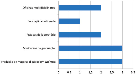Das atividades desenvolvidas com professores (Figura 8) dentro dos museus, 11 museus especificaram quais sao as atividades realizadas sendo, minicursos desenvolvidos pela graduaçao (27%), produçao de material didático em Química (27%), práticas para serem aplicadas em laboratório (18%), oficinas multidisciplinares (18%) e formaçao continuada (10%). Como temáticas dos minicursos desenvolvidos pela graduaçao, os responsáveis destacaram que sao ligadas ao cotidiano ou que podem envolver outras áreas dos museus: "Química do dia a dia", "Química na cozinha", "Os processos Químicos no cotidiano", "Química uma questao ambiental", "A Química no espaço". O Centro de Ciências da Universidade Federal de Juiz de Fora produz kits com materiais práticos para serem aplicados em sala de aula, oferecendo cursos de formaçao para professores para sua utilizaçao. Eles desenvolvem também atividades para alunos com deficiência visual, como o uso de tabela periódica adaptada, e para alunos com deficiência auditiva. Esses projetos se iniciaram após o contato de uma aluna com deficiência auditiva que participou da exposiçao Cadê a Química? e sentiu-se incluída pela qualidade das atividades.