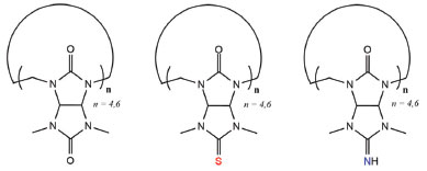 Heck e colaboradores36 obtiveram os derivados alil-bambus[4]urila (AlilBU[4]) e alil-bambus[6]urila (AlilBU[6]) a partir de síntese assistida por micro-ondas, utilizando a di-alil-glicolurila como precursor. Alteraçoes nas condiçoes de síntese levavam a diferentes distribuiçoes de homólogos. Além disso, os autores obtiveram a PrBU[4] a partir da hidrogenaçao catalítica da AlilBU[4] utilizando H2 na presença de catalisador 10% Pd/C em etanol. Sindelar e colaboradores sintetizaram a p-carboxi-benzil-bambus[6]urila (BzCOOH)BU[6],37 de elevada solubilidade em meio aquoso neutro e básico, e as 3-carboxipropil-bambus[6]urila (PrCOOH)BU[6] e 5-carboxipentil-bambus[6]urila (pentilCOOH)BU[6].38 A afinidade por ânions destes últimos é modulada tanto pelo tamanho do substituinte R ligado à BU[6] quanto pelo pH da soluçao. A obtençao de derivados das BU[n] solúveis em água e com afinidade por ânions representa um passo importante para o estudo destes cavitandos, uma vez que permite contornar limitaçoes óbvias no que tange às aplicaçoes, como em bioquímica e medicina,2,33 por exemplo, e foram assunto de investigaçoes recentes. Além de BU[n] modificadas com diversos grupos laterais R, foram sintetizados outros derivados por substituiçao do átomo de oxigênio do grupamento 1,3-dimetilureia do macrociclo (Figura 6). As metil-semitio-bambus[4]urila (MeBUS[4]) e metil-semitio-bambus[6]urila (MeBUS[6]),39 por exemplo, sao obtidas a partir da reaçao da 2,4-dimetil-semitio-glicolurila com paraformaldeído em meio ácido. Um ponto interessante é que esses derivados das BU[n] sao capazes de incluir ânions em seu interior e complexar cátions como Pd2+ e Hg2+ nos portais de seus opérculos por meio dos átomos de enxofre.