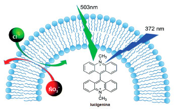 ![]() Figura 9. Representaçao esquemática do influxo de íon cloreto e efluxo de íon nitrato através de vesículas de POPC, monitorada pela fluorescência da lucigenina. Reproduzido parcialmente com permissao da The Royal Society of Chemistry (2017, v. 53, p. 7558)