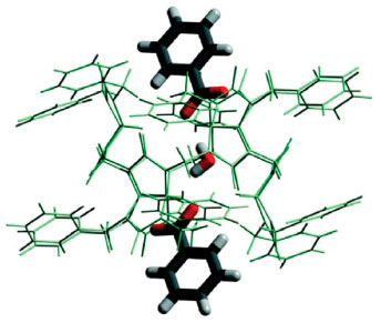 ![]() Figura 10. Visao lateral da estrutura cristalina do complexo de íons benzoato com a BnBU[6] na proporçao 2:1. Reproduzido com permissao da The Royal Society of Chemistry (2014, v. 50, p. 1372)