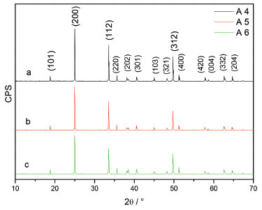 ![]() Figura 1. DRX da matriz YVO4 dopado com 3% de íon Eu3+ variando a concentraçao do íon Bi3+, a) 1%, b) 3% e c) 5%