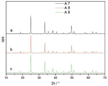 RESULTADOS E DISCUSSAO As Figuras 1 e 2 apresentam os difratogramas de raios X para as amostras A4 à A9, tratadas à 1000 ºC para as amostras A1, 2 e 3 nao estao apresentados, os difratogramas constam na literatura.20