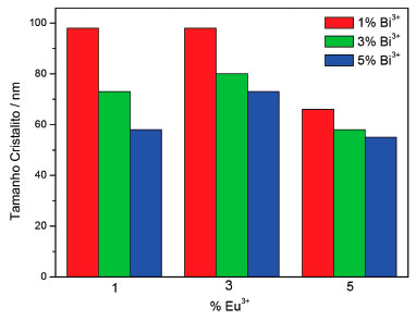 O tamanho médio dos cristalitos apresentou um comportamento semelhante para as amostras em funçao do aumento da porcentagem do íon Bi3+, para as amostras contendo porcentagens fixas de íon Eu3+ o tamanho do cristalito diminui com o aumento da concentraçao do íon Bi3+, fato que pode estar relacionado com a migraçao dos dopantes para a superfície ou regioes de contorno das partículas impedindo o seu crescimento.51,52 A Figura 3 mostra a dependência do tamanho do cristalito em funçao do aumento da concentraçao do íon Bi3+.