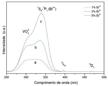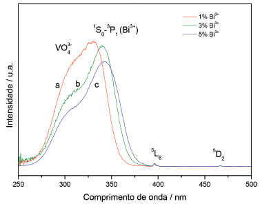 ![]() Figura 4. Espectro de excitaçao para matriz de YVO4 dopada com 3% do íon Eu3+ com variaçao da concentraçao do íon Bi3+ em 1% (a), 3% (b) e 5% (c)