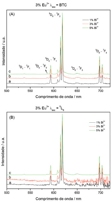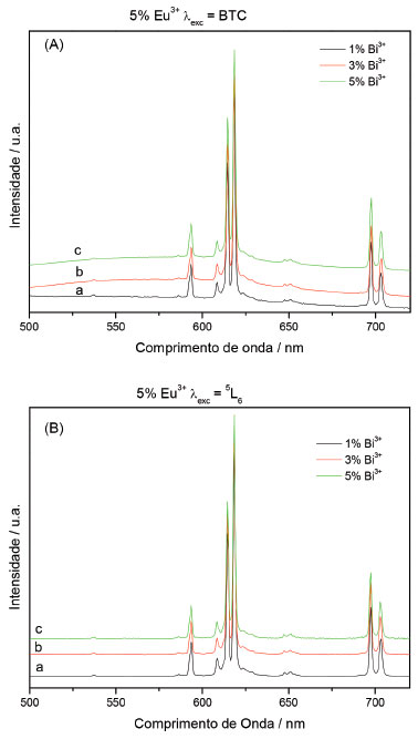 ![]() Figura 7. Espectros de emissao da matriz de YVO4 dopada com 5% do íon Eu3+ com variaçao da concentraçao do íon Bi3+ em 1% (a), 3% (b) e 5% (c), λexc = BTC (A) e 5L6 (B)