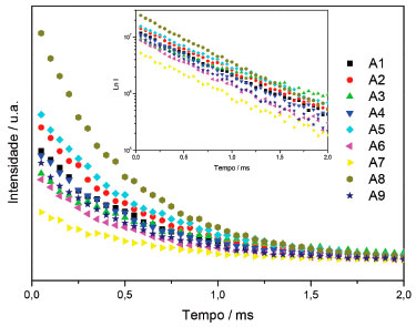 ![]() Figura 8. Curvas de decaimento da luminescência para as amostras excitadas no nível 5L6, fixando o comprimento de emissao no nível 7F2