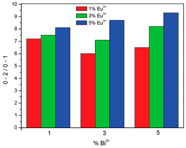 A mudança no ambiente químico ao redor do íon Eu3+ pode afetar a intensidade das bandas relativas as transiçoes do estado excitado 5D0 para o fundamental 7FJ (J = 0, 2, 3 e 4), com exceçao da transiçao de dipolo magnético 5D0 → 7F1, portanto, essa transiçao pode ser utilizada como padrao para medidas de intensidades relativas das outras bandas do espectro de emissao.58,59 Assim, pequenas alteraçoes nessa razao poderá indicar mudanças na simetria do íon Eu3+. A Figura 9 mostra as razoes de intensidades relativas das bandas correspondentes às transiçoes 5Do → 7F2 / 5Do → 7F1 em funçao das concentraçoes dos íons Eu3+ e Bi3+.