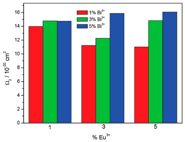 ![]() Figura 10. Parâmetro de intensidade (Ω2) em funçao das concentraçoes dos íons Eu3+ e Bi3+
