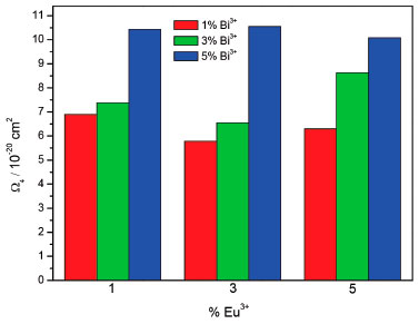![]() Figura 11. Parâmetro de intensidade (Ω4) em funçao das concentraçoes dos íons Eu3+ e Bi3+