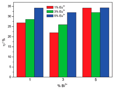 ![]() Figura 12. Eficiência quântica (η) em funçao das concentraçoes dos íons Eu3+ e Bi3+