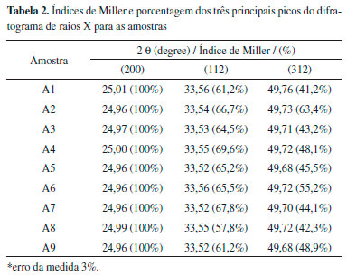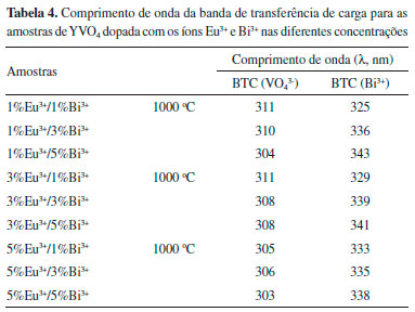 A Tabela 4 apresenta os valores de comprimento de onda relativos as bandas de transferência de carga (BTC) atribuídas ao ânion vanadato e ao íon bismuto III para as amostras.