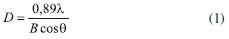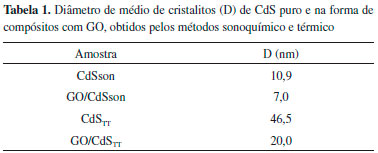 Os diâmetros médios de cristalitos das amostras de CdS puro e na forma de compósitos foram determinados a partir de dados de raios X. A equaçao de Scherrer (equaçao 1) foi empregada nos cálculos, considerando as partículas esféricas; onde D é o diâmetro médio dos cristalitos, λ é o comprimento de onda dos raios X (1,541 Å), B é a largura a meia altura de um pico de difraçao em 2θ. ![]() O pico centrado em torno de 43,8° (2θ) foi selecionado para os cálculos por ser o de melhor resoluçao com maior intensidade nas quatro amostras. Os resultados encontram-se na Tabela 1 e constatam que o método sonoquímico é capaz de produzir cristalitos com diâmetro médio menor que o método térmico, como previsto.25 Além disso, a adiçao de GO às amostras de CdS durante a síntese contribui para reduçao do tamanho de partícula. No caso específico de GO/CdSTT, essa reduçao no diâmetro de cristalitos pode estar associada, também, à etapa de tratamento ultrassônico com o GO durante o preparo do compósito.