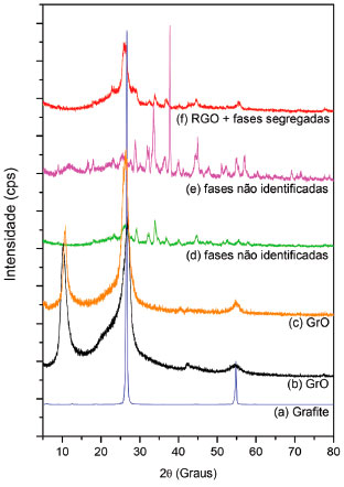 ![]() Figura 1. Difratogramas de raios X das amostras de grafite (a), óxido de grafite, GrO, (b), GrO sonicado em água (c), GrO sonicado em soluçao aquosa contendo o par redox S2-/SO32- em meio básico (d), GrO esfoliado (em sol. S2-/SO32-) e irradiado sem platina (e), GrO esfoliado (em sol. S2-/SO32-) e irradiado em presença de platina (f)