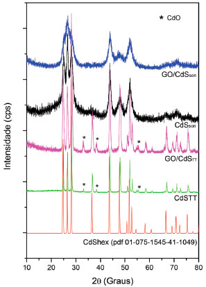 Os difratogramas de raios X das amostras de CdS preparadas pelos métodos sonoquímico (CdSson) e térmico (CdSTT), assim como os dos compósitos GO/CdSson e GO/CdSTT sao apresentados na Figura 2, acompanhados do padrao difraçao de CdS em fase hexagonal (pdf 01-075-1545-41-1049) para comparaçao. Em todos os casos é possível identificar os conjuntos de picos característicos dessa fase, porém, as amostras obtidas pelo método térmico apresentam picos estreitos e bem resolvidos, evidenciando elevada cristalinidade, característico de materiais obtidos por via térmica. Nos DRX das amostras de CdS térmico também é possível identificar uma fase segregada minoritária de CdO (pdf 01-073-2245-5-640), formada, provavelmente, devido à presença de traços de oxigênio durante o tratamento térmico em atmosfera de nitrogênio. Já os difratogramas das amostras de CdS obtidos pelo método sonoquímico nao apresentam picos referentes à fase segregada, mas os picos associados à fase hexagonal sao alargados em funçao da diminuiçao do tamanho dos cristalitos (uma discussao completa acerca da caracterizaçao das nanopartículas de CdS obtidas por via sonoquímica pode ser encontrada na referência 25). Os difratogramas dos compósitos GO/CdSson e GO/CdSTT nao apresentam diferenças significativas quando comparados aos de CdS puro obtido pelo respectivo método de síntese, nao sendo possível identificar picos associados aos materiais carbonáceos tais como grafite, óxido de grafeno ou óxido de grafeno reduzido.