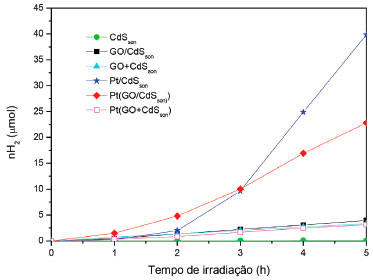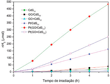 ![]() Figura 3. Produçao fotocatalítica de hidrogênio (λ > 400 nm) empregando CdS puro e compósitos com GO e/ou Pt em diferentes configuraçoes obtidos pelo método sonoquímico