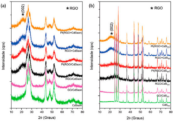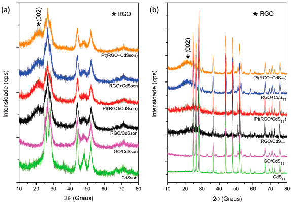 A amostra Pt(GO/CdSTT) foi a que apresentou maior fotoatividade, com uma taxa de produçao de hidrogênio de 651,6 µmol gcat-1 h-1. Esse resultado é superior aos obtidos por Leo e colaboradores36 e Singh e colaboradores37 que avaliaram a atividade fotocatalítica de compósitos GO/CdS obtidos pelo método solvotérmico, seguido de reduçao química, e pelo método de reaçao gás-sólido, respectivamente, empregando o mesmo par de reagentes de sacrifício. Outros trabalhos38-41 apresentaram taxas de produçao de hidrogênio superiores, especialmente quando o método solvotérmico é empregado na síntese dos fotocatalisadores; porém, nesses casos, foram feitas modificaçoes químicas no GO, tais como inserçao de dopantes, e outros reagentes de sacrifício foram usados. Para avaliar a restauraçao da rede π conjugada de átomos de carbono sp2 pelo processo de fotorreduçao do óxido de grafeno (GO), os compósitos foram coletados ao final das 5 horas de irradiaçao para análise por difratometria de raios X e espectroscopia Raman e comparados com os materiais antes da irradiaçao. Os fotocatalisadores pós irradiados foram submetidos à análise de difraçao de raios X para identificar picos referentes aos materiais carbonáceos. Nestes casos, as amostras pós irradiadas foram renomeadas substituindo GO por RGO, visto que há indícios de reduçao do óxido de grafeno durante as reaçoes fotocatalíticas. A Figura 5 mostra os difratogramas de raios X das amostras de CdS e compósitos após irradiaçao e compara com as amostras de CdS puro e compósito GO/CdS antes da irradiaçao para os dois métodos de síntese: (a) sonoquímico e (b) térmico. Os DRX das amostras GO/CdSson e GO/CdSTT (antes da irradiaçao) apresentam apenas picos referentes ao CdS em fase hexagonal e é semelhante ao padrao de difraçao do CdS puro obtido pelo respectivo método de síntese, nao sendo possível identificar o pico em 10º (2θ) associado ao conjunto de planos (002) do GO. Entretanto, após irradiaçao, todas as amostras, exceto RGO/CdSTT e Pt(RGO/CdSTT), apresentaram um pico largo em 21,04º (2θ), associado ao óxido de grafeno reduzido.42-44 A regeneraçao do pico referente ao conjunto de planos (002) do grafite, originalmente em 26,68º (2θ), agora deslocado para 21,04º (2θ), indica um aumento significativo da distância interplanar, de 3,34 Å no grafite para 4,22 Å no óxido de grafeno reduzido presente nos compósitos após irradiaçao, assim como o alargamento do pico está associado a diminuiçao do grau de empilhamento das lâminas de grafeno. Os DRX das amostras RGO/CdSTT e Pt(RGO/CdSTT), embora apresentem o pico referente ao conjunto de planos (002) deslocados para menor ângulo em relaçao grafite, o deslocamento foi menor comparado ao das demais amostras, assim como sua intensidade, provavelmente devido à maior agregaçao das lâminas, como consequência do tratamento térmico no processo de obtençao desses fotocatalisadores.