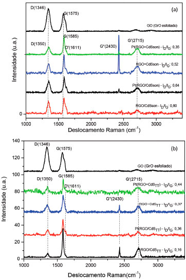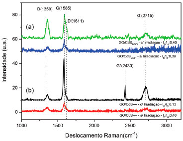 ![]() Figura 6. Espectros Raman dos compósitos GO/CdS, antes e após a irradiaçao, obtidos pelas vias sonoquímica (a) e térmica (b)