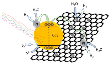 Durante a reaçao fotocatalítica tanto Pt(IV) quanto o óxido de grafeno sao reduzidos, com possibilidade de fotodeposiçao de Pt0 na superfície de CdS e na do próprio RGO. O óxido de grafeno reduzido atua como aprisionador de elétrons que podem ser transferidos diretamente para moléculas de água adsorvidas à sua superfície ou podem ser transferidos para nanopartículas de platina que também promoverao a reduçao de H2O a H2. Além disso, a reduçao ainda pode se dar na superfície do CdS, na qual também ocorre a oxidaçao do sulfeto a polissulfetos pelas lacunas fotogeradas.