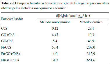 A Tabela 2 compara as taxas de evoluçao de hidrogênio para amostras obtidas pelo método sonoquímico e pelo método térmico e revela que os fotocatalisadores obtidos pelo segundo método sao mais ativos que aqueles obtidos pelo primeiro. Pode-se concluir que a maior fotoatividade na geraçao de hidrogênio está associada à maior cristalinidade dos materiais obtidos pelo método térmico, à maior dispersao do GO no compósito quando inserido durante a síntese e à presença da platina que atua como cocatalisador, além de auxiliar no processo de reduçao do óxido de grafeno como sugerem os resultados de difratometria de raios X apresentados na Figura 1. Sólidos mais cristalinos apresentam menor número de defeitos, geralmente, relacionados ao fenômeno de recombinaçao de cargas fotogeradas com a excitaçao do semicondutor, o que resulta em perda de energia na forma de calor. Esse fenômeno diminui a quantidade de portadores de carga e limita sua transferência na interface fotocatalisador/soluçao para promover as reaçoes redox. A forma de adiçao do GO também é um fator que interfere na fotoatividade, visto que a adiçao de GO durante o processo de síntese, em geral, resulta em maiores taxas de produçao de hidrogênio quando comparada à mistura mecânica, provavelmente, devido à maior dispersao do GO no compósito.