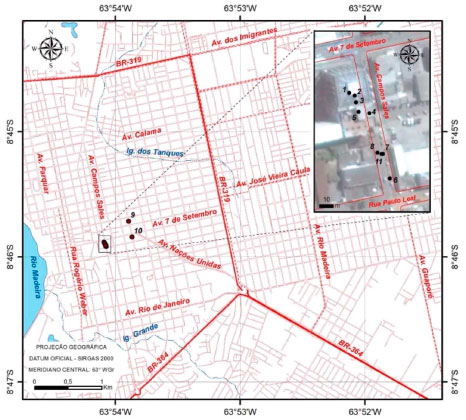 ![]() Figura 2. Mapa da localizaçao dos comércios de ouro estudados no município de Porto Velho/RO