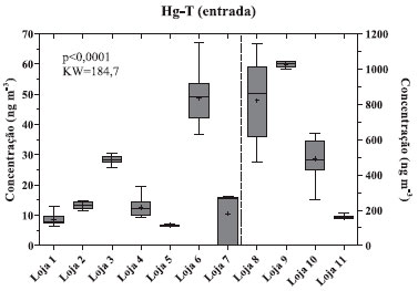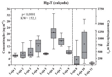 ![]() Figura 3. Box plot representando as concentraçoes de Hg0 (ng m-3) no ar atmosférico na calçada dos comércios de compra e venda de ouro de Porto Velho, Rondônia. O eixo Y secundário (direita) corresponde às concentraçoes das lojas 8, 10 e 11, enquanto que o eixo Y principal (esquerda) refere-se às concentraçoes das demais lojas avaliadas