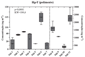 ![]() Figura 5. Box plot representando às concentraçoes de Hg0 (ng m-3) no ar atmosférico na sala de polimento dos comércios de compra e venda de ouro de Porto Velho, Rondônia. O eixo Y secundário (direita) corresponde às concentraçoes das lojas 8, 9, 10 e 11, enquanto que o eixo Y principal (esquerda) refere-se às concentraçoes das demais lojas avaliadas