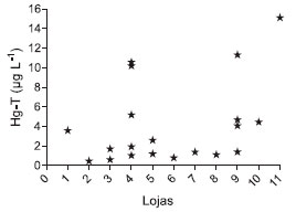 RESULTADOS E DISCUSSAO A Figura 3 apresenta os dados das concentraçoes de Hg referente à entrada das lojas (calçada). O primeiro ponto amostral em cada comércio foi na calçada, do lado de fora, em frente ao comércio. Concentraçoes acima de 200 ng m-3 de Hg foram observadas nas lojas 8, 10 e 11. Ocorreram diferenças significativas entre concentraçoes médias de Hg0 nas calçadas das 11 lojas comercializadoras de ouro estudadas (p<0,0001) com destaque para as lojas 4, 6, 7, 8, 10 e 11 que apresentaram concentraçoes médias de Hg0 mais elevadas em relaçao às demais lojas (Figura 3).