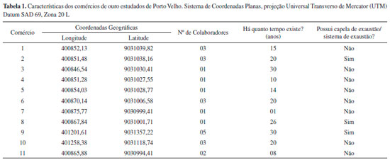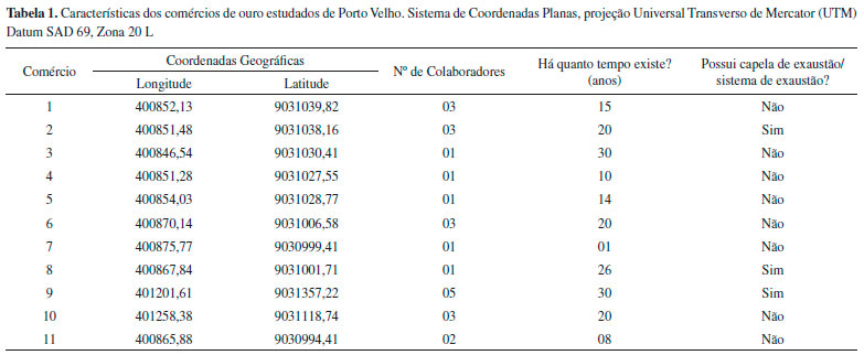 Métodos As concentraçoes atmosféricas de Hg nos comércios de ouro foram obtidas utilizando-se o analisador Zeeman portátil de mercúrio, modelo Lumex RA-915M (Lumex Instruments, Saint Petersburg, Rússia), que é um analisador de mercúrio gasoso (Hg0) no ar baseado na técnica de espectrometria de absorçao atômica com efeito Zeeman (ZAAS-HFM), utilizando uma modulaçao de alta frequência de polarizaçao da luz. Este equipamento possui limites de detecçao muito baixos de 0,5 ng m-3 e opera em tempo real para gases e ar atmosférico, nao necessecitando de pré-tratamento ou concentraçao das amostras.25 Desta forma, foram avaliados diferentes pontos dos comércios formando-se um conjunto de avaliaçao desde a entrada da loja (calçada), recepçao (entrada) e a sala de queima do ouro ou polimento de joias (polimento). A coleta foi realizada pela manha no período de seca na regiao (out/2015 e nov/2016), em dias ensolarados, com temperaturas acima de 30 ºC. Padronizaram-se as mediçoes de Hg0 atmosférico a uma altura de 50 cm do chao. As integraçoes ocorreram a cada 10 segundos durante 3 minutos em cada ponto amostral. As mediçoes em tempo real foram feitas com a visualizaçao do processo em um display digital do aparelho e a gravaçao dos dados foi feita por conexao do instrumento ao laptop. Este estudo foi realizado em 11 comércios de compra e venda de ouro da cidade de Porto Velho. Para avaliar a exposiçao ocupacional aos vapores de Hg0 também foram coletadas e analisadas amostras de urina de 20 trabalhadores. Para isso, esta pesquisa foi submetida ao Comitê de Ética em Pesquisa da Fundaçao Universidade Federal de Rondônia (Parecer CAAE 48095315.3.0000.5300) e aprovada em 14/12/2015. Todos os sujeitos participantes desta pesquisa receberam orientaçoes de acordo com a Resoluçao nº 466, de 12 de dezembro de 2012 e assinaram o Termo de Consentimento Livre e Esclarecido (TCLE). Os resultados obtidos nesta pesquisa foram entregues a cada participante individualmente e sigilosamente. Na Tabela 1 sao apresentadas algumas informaçoes e características relevantes sobre os comércios de ouro avaliados em Porto Velho.