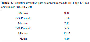 Uma avaliaçao no entorno dos comércios estudados demonstrou que as concentraçoes de Hg variaram de 5,41 a 7,20 ng m-3, evidenciando que a contaminaçao por Hg é pontual, somente no interior de alguns comércios. Segundo Lacerda e Marins,29 as emissoes de Hg de mineraçao de ouro sao praticamente restritas à regiao amazônica, que resulta em uma alta emissao por área de aproximadamente 16 g km-2, e taxas de deposiçao atmosférica maiores do que em áreas industriais. O estudo de Artaxo et al. mostrou que as concentraçoes de Hg de áreas virgens e áreas que nao estejam localizadas próximas às regioes de mineraçao de ouro apresenta valores de background de Hg variando de 0,5 a 2,0 ng m-3 e, nas áreas que sao fortemente impactadas pela atividade de mineraçao de ouro ou de queima de biomassa as concentraçoes de Hg total variaram de 5,0 a 14,0 ng m-3.30 Considerando os três pontos amostrais em cada comércio, o comércio 5 apresentou os menores valores médios de Hg atmosférico, 6,86 ng m-3 e o comércio 8 apresentou os maiores valores médios, 878,85 ng m-3 de Hg. A concentraçao mais alta foi no comércio 10, com 2.576,24 ng m-3 de Hg, na sala de polimento. No entanto, esses resultados sao inferiores aos obtidos na pesquisa de Malm (1991),19 na qual foram encontradas concentraçoes de Hg variando de 450 a 7.500 ng m-3, com média de 2.800 ng m-3, no ar urbano próximo aos comércios de ouro na cidade de Porto Velho/RO e concentraçoes de Hg entre 100.000 a 107.200 ng m-3, no ambiente ocupacional nos comércios durante a fusao do ouro. Esses resultados indicam que, atualmente, a exposiçao ocupacional ao Hg é inferior ao auge da atividade garimpeira de ouro no rio Madeira, fato que se deve à reduçao no volume de ouro comercializado na regiao, melhoramento nos processos de amalgamaçao e recuperaçao do Hg utilizado através dos cadinhos (retorta), bem como às legislaçoes impostas pelo Estado e seus órgaos ambientais fiscalizadores. A Organizaçao Mundial de Saúde (OMS) define uma concentraçao tolerável de 200 ng m-3 para exposiçao por inalaçao em longo prazo para vapor de Hg e a legislaçao brasileira NR-15 dispoe sobre o limite de tolerância no local de trabalho (Hg, todas as formas exceto orgânicas) de 0,04 mg m-3 (40.000 ng m-3) até 48 horas/semana.31,32 Ainda que as concentraçoes de Hg atmosférico tenham diminuído em relaçao a década de 80 e 90, as concentraçoes de vapor de Hg em certos ambientes de comercializaçao de ouro em Porto Velho continuam altas, acima do recomendado pela OMS, o que pode em longo prazo provocar danos à saúde dos trabalhadores. A Tabela 2 mostra a estatística descritiva da concentraçao de Hg-T nas amostras de urina dos 20 trabalhadores das lojas de comercializaçao de ouro de Porto Velho.