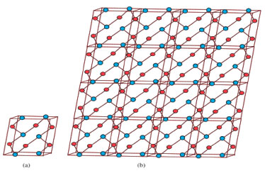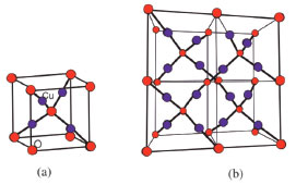 ![]() Figure 3. Copper (II) oxide CuO: (a) is the unit cell with blue and red circles represents copper and oxygen atom, respectively (b) shows the lattice CuO[4, 4]
