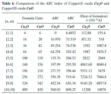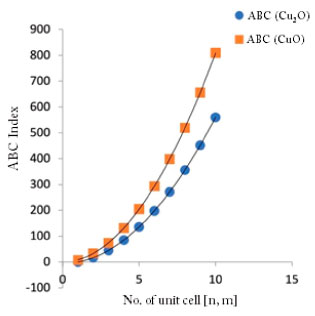 "Comparison of ABC indices for both the oxides of Copper showed higher values for CuO compared to those of (Table 6). For example, ratio of ABC(CuO)/ABC() for [2,2] cell is 1.95 and it decreases to 1.44 for [10,10]. This shows its decreasing trend with the increase of cells."