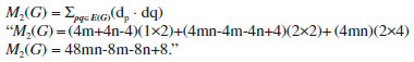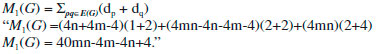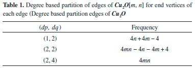 In the next Theorem, we have computed the exact result of first and second Zagreb index for the chemical graph Cu2O[m, n]." Theorem 1. "Consider the graph of G ≅ Cu2O[m,n] with m, n ≥ 1, then its first and second Zagreb index is equal to," ![]() Proof. "Let G be the crystallographic structure of [m, n].The first Zagreb index is computed as below:" ![]() "By using Table 1 and Equation 1 the second Zagreb index are computed as below:" ![]() "In the next Theorem, we have computed the exact result of ABC index for the chemical graph Cu2O[m, n]." ![]() Theorem 2. "Consider the graph of G ≅ Cu2O[m,n] with m, n ≥ 1, then its ABC index is equal to," Proof. "Let G be the chemical graph of Cu2O[m,n]. Then by using Table 1 and equation (3) the ABC index is computed as below:" ![]() "The Table 2 shows partition of edges of the chemical graph Cu2O[m,n] depending on the sum of degrees of the neighbouring vertices of end vertices of each edge."