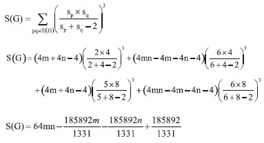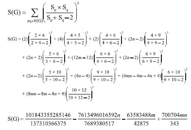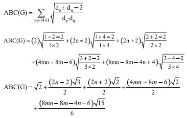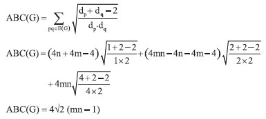 In the next Theorem, we have computed the exact value of first and second Zagreb index for the chemical graph CuO[m, n]." Theorem 4. "Consider the graph of G ∼= CuO[m, n] with m, n ≥ 1, then its first and second Zagreb index is equal to," ![]() Proof. "Let G be the crystallographic structure of CuO[m, n]. The first Zagreb index is computed as: ![]() "In the next Theorem, we have computed the exact result of ABC index for the chemical graph CuO[m, n]." Theorem 5. "Consider the graph of G ∼= CuO[m, n] with m, n ≥ 1, then its ABC index is equal to" ![]() Proof. Let G be the chemical graph of CuO[m, n]. Then by using Table 3 and equation (3) the ABC index is computed as below: ![]()