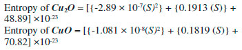 These equations can be used for the transformation of ABC indices into the approximate heat of formation of the oxides of Cu at any cubic level. Figure 6 shows a linear relation of Sanskruti indices with number of formula units and analysis showed higher indices for Cu2O compared to CuO. Previous studies have shown an association of Sanskruti indices with entropy of octance.15 Here we calculated the entropy of both the oxides at different cells from the standard molar entropy. For instance, standard molar entropy for CuO is 93 J mol-1 K-1 so for one formula unit it will be 93/6.022x10-23 J K-1, and for each cell we just multiplied the obtained value with the no. of formula units present in the cell. Similarly entropy for Cu2O calculated considering standard molar entropy 43 J mol-1 K-1 (Table 7). Analysis of the data showed a considerable difference between the Sanskruti indices and entropies for the oxides of Cu (Table 7). Therefore, we determined a mathematical relation for the transformation of Sanskruti indices into approximate entropies of both the oxides of copper as below: ![]()