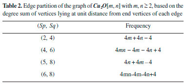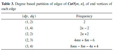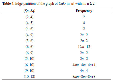 "The Table 4 shows partition of edges of the chemical graph CuO[m, n], which depends on the sum of degrees of the neighboring vertices."