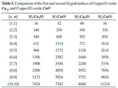 The next Theorem shows the exact value of Sanskruti index of CuO[m, n] . Theorem 6. "Consider the graph G ∼= CuO[m, n] with m, n ≥ 2, then its Sanskruti index S(G) is equal to:" ![]() Proof. Let G be the crystallographic structure of CuO[m, n]. Then by using Table 4 and equation (4) the Sanskruti index S(G) is computed as follows: ![]() RESULTS AND DISCUSSIONS "In this section we have compared the first (M1) and second Zegrab (M2) indices of Copper(I) oxide Cu2O and Copper(II) oxide CuO which is shown in Table 5. Analysis of the data showed that both the indices are higher in CuO compared to those of . For instance, M1(CuO)/M1() for [1,1] cell is 1.44 and the ratio increases to 1.943 for [7,7] and then it decrease to 1.87 for [10,10] cell. On the other hand, M2(CuO)/M2() for [1,1] is 1.40 and the ratio gradually increases to 2.413 for [10,10] cell."