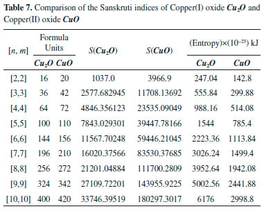 "In the Table 7, we gave a comparison of the Sanskruti indices of Copper(I) oxide Cu2O and Copper(II) oxide CuO. Analysis of the data showed that host higher Sanskruti index compared to CuO. The S(CuO)/S() for [2,2] is 3.825 and it increases to 5.34 for [10,10]. This shows its increasing trend with the increase of cells."