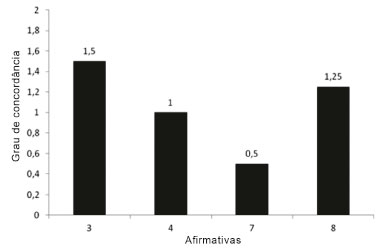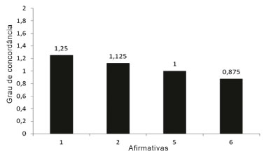 ![]() Figura 1. Grau de concordância dos estudantes frente às afirmativas elaboradas para avaliaçao da contribuiçao da metodologia para o desenvolvimento de conteúdos procedimentais. As afirmativas analisadas correspondem a: 1.Minhas habilidades de comunicaçao oral; 2. Minhas habilidades de comunicaçao escrita; 5. Minhas habilidades de argumentaçao diante de questionamentos; 6. Minhas habilidades de persuasao na apresentaçao de minhas conclusoes