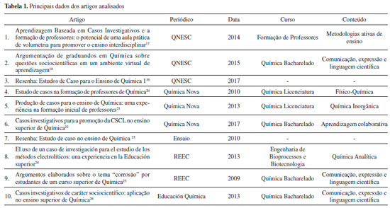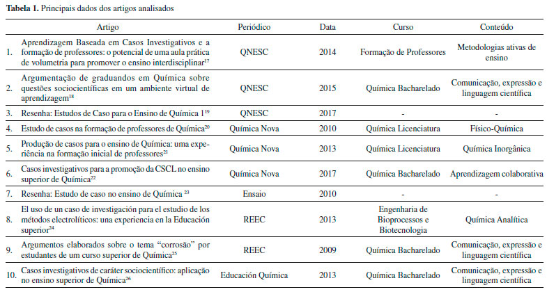 Os artigos selecionados foram analisados quanto aos objetivos do estudo, às formas de trabalho adotadas (grupo ou individual), à apresentaçao das resoluçoes dos casos (produçao textual, plenária, etc), às habilidades desenvolvidas e às dificuldades encontradas no emprego da metodologia proposta. A partir desse quadro é possível perceber que os EC podem ser empregados à formaçao de diferentes profissionais, objetivos de pesquisa e conteúdos. Com isso, destaca-se a versatilidade do método. Nos artigos enumerados na Tabela 1 como 1, 4 e 5, voltados à formaçao de professores de Química, entre os principais objetivos destacados está a capacitaçao destes estudantes para o uso da metodologia. De acordo com Massena e colaboradores,21 os professores apresentam dificuldades em trabalhar com os EC por nao possuírem a devida formaçao. Resultado que vai ao encontro das ideias de Pinheiro e colaboradores,20 ao trazerem a compreensao de que os estudantes de licenciatura, em sua formaçao acadêmica, possuem uma vivência muito diferente daquela que irao encontrar em sua vida profissional e, portanto, é necessário nao só apresentar a metodologia aos discentes, mas também demonstrar como desenvolvê-la em sala de aula e como elaborar os casos a serem utilizados. Tendo isso em vista, no artigo 5, os estudantes foram estimulados a produzirem casos sobre os conteúdos abordados na disciplina em questao (Química Inorgânica). Com esta atividade, eles tiveram um contato maior com a sua futura prática profissional, o que lhes proporcionou perceber algumas das dificuldades que irao enfrentar como, por exemplo, a adequaçao de conteúdos ao ensino médio. Já nos artigos 1 e 4 a pesquisa foi direcionada à vivência dos estudantes com a metodologia, nesses estudos, os casos foram apresentados ao grupo de alunos e estes tiveram a tarefa de resolvê-los. Os artigos 2, 6, 8, 9 e 10 - voltados a estudantes de bacharelado em Química - possuíam como principais objetivos a análise das habilidades desenvolvidas com a aplicaçao do método. Em 2, 9 e 10 os estudos estavam voltados para a habilidade de argumentaçao. Essa habilidade é destacada pelos pesquisadores como sendo de grande importância no aprendizado das Ciências, pois, conforme Souza e colaboradores, oportuniza aos alunos "alcançar um entendimento mais amplo e aprofundado sobre o tema em foco" (p. 96)18 quando lhes é estabelecida a necessidade de se posicionar sobre um tema e justificar esse posicionamento. Percebe-se que em nenhum dos artigos analisados foi apresentado uma avaliaçao da contribuiçao da metodologia para o desenvolvimento de conceitos químicos e que, em sua maioria, os casos foram empregados em disciplinas que estao relacionadas ao desenvolvimento de outras habilidades, como leitura, escrita e argumentaçao oral (artigo 6). Apenas três estudos foram realizados em disciplinas de conhecimentos específicos de Química. Apesar de existirem várias formas de se trabalhar com EC,8,13 nos artigos analisados destacam-se o formato de trabalho em grupos ou em duplas, tanto para resolver os casos, quanto para elaborar as estórias.18 Nestes exemplares, as turmas foram divididas e os casos distribuídos aleatoriamente para sua resoluçao. Mostrou-se como estratégia recorrente a utilizaçao de uma plataforma digital, para favorecer as discussoes entre os estudantes.18,22 A forma como as resoluçoes dos casos foram apresentadas tiveram algumas variantes, como no artigo 1, no qual os estudantes deveriam resolver um caso sobre volumetria, o qual deveria ser discutido em grupo e as práticas efetuadas individualmente. Nos artigos 2 e 6, a resoluçao dos casos foi dividida em etapas: na primeira etapa os estudantes deveriam elaborar um texto de forma individual propondo uma soluçao para o seu caso. Após isso o professor selecionou duplas de trabalho de modo que as visoes de seus componentes fossem opostas, para a resoluçao do problema e de forma colaborativa - através de uma plataforma digital - deveriam solucionar o problema. Numa seguinte etapa, os estudantes deveriam elaborar, novamente de forma individual, um texto com a sua resoluçao final sobre o caso. O artigo 4 demonstra uma maior preocupaçao em diagnosticar as dificuldades que professores de Química do ensino médio poderao enfrentar, tanto com relaçao aos seus conhecimentos sobre o tema, quanto com relaçao à infraestrutura de seu local de trabalho. No artigo 5, também voltado para a formaçao de professores de Química, os estudantes deveriam elaborar um Diário do Caso "este diário deveria deixar claro ao leitor o processo que conduzirá o grupo à resoluçao do caso, com reflexoes acerca das atividades e arquivo de todo o material empregado como fonte de pesquisa" (p. 1067).21 Este recurso de produçao textual também foi descrito no artigo 10, porém, nessa proposta o professor solicitou a produçao textual individual. Para os estudantes que participaram da pesquisa relatada no artigo 8, foi solicitado que elaborassem um relatório do caso no qual deveria ser apresentada uma soluçao para o caso proposto e os conceitos científicos envolvidos no mesmo. A apresentaçao oral foi indicada como estratégia de exposiçao das soluçoes para os casos apenas no artigo 9. Os pesquisadores apontam, de forma geral, que essa estratégia de ensino favorece o desenvolvimento da comunicaçao oral e escrita, a capacidade de resolver problemas reais e da capacidade de tomada de decisao.24-26 Conforme enfatiza Francisco,24 essa última habilidade (capacidade de tomada de decisao) é essencial para uma abordagem do ponto de vista da Ciência, Tecnologia e Sociedade, para contemplar uma sociedade mais democrática. O trabalho colaborativo22 ou cooperativo24-26 também foi destacado pelos autores como um ponto positivo da metodologia, pois a capacidade de trabalhar em grupo, a partir das discussoes realizadas, propicia a construçao do conhecimento. O método é aponta