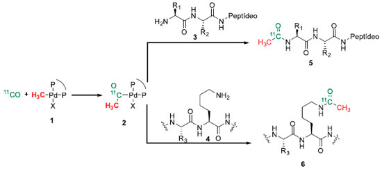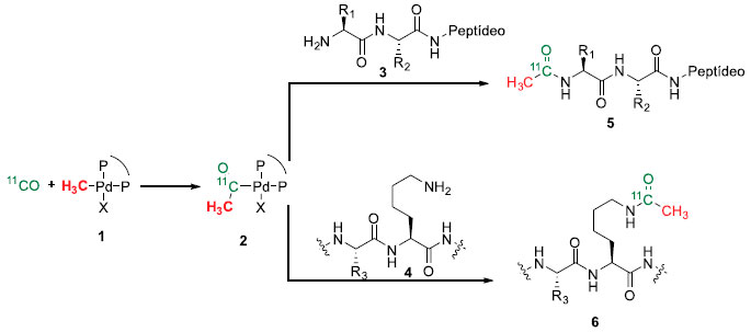 REAÇOES DE ACOPLAMENTO Dentre as diversas descobertas na área científica nos últimos tempos, o uso do níquel como catalisador para reaçoes de acoplamento cruzado, foi muito importante, sendo uma das mais poderosas ferramentas desse tipo de reaçao, que se mostrou bastante efetiva, principalmente nas reaçoes de Suzuki-Myaura e Negishi.1 Porém, seu uso nao ficou restrito a essas aplicaçoes, novos sistemas utilizando a catálise por níquel9 foram desenvolvidas como pode ser observada a seguir. Reaçoes de carbonilaçao Skrydstrup e colaboradores, recentemente descreveram uma metodologia para a reaçao de 11C-acetilaçao de N-terminais e N-lisinas em peptídeos através de um acoplamento carbonilativo catalisado por paládio, empregando [11C]CO (Esquema 1). Porém, neste caso, apenas produtos acetilados com substituintes metilas foram obtidos. Complexos de paládio com substituintes alquílicos contendo cadeias carbônicas mais longas nao foram utilizadas. Talvez, por falta de estabilidade desses complexos, visto que estes sofrem β-eliminaçao de hidreto facilmente.10