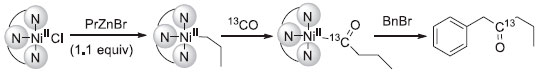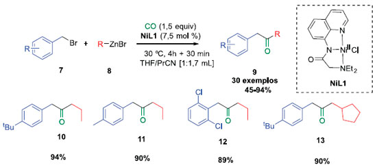 Porém, pouco depois, Skrydstrup descreveu uma metodologia de carbonilaçao similar, utilizando complexos de níquel.11,12 O uso de níquel permitiu a obtençao de complexos acilados com cadeias maiores, com intuito de realizar o primeiro acoplamento carbonilativo entre nucleófilos e eletrófilos sp3. Os complexos foram utilizados devido à forte ligaçao dos três nitrogênios ligados ao metal central, prevenindo, assim, ligaçoes de múltiplas unidades de CO com alguns intermediários reativos, além de impedir a β-eliminaçao de hidreto, que ocorre facilmente com o paládio. Assim, foi reportado o uso desses complexos para o acoplamento cruzado de Negishi, entre reagentes de zinco com brometos de benzila, em atmosfera de CO, pelo uso do sistema de duas câmaras. A viabilidade dessa metodologia é um desafio, já que é um grande problema encontrado nas reaçoes de carbonilaçao catalisadas por paládio, devido a inerente tendência dos complexos alquila de paládio de sofrerem β-eliminaçao de hidreto.13 Primeiramente foi investigado uma série de complexos de níquel(II) e sua habilidade para mediar uma sequência de etapas de reaçoes (Esquema 2). Essas etapas consistem em transmetalaçao com reagentes organometálicos, seguido pela inserçao migratória de 13CO para a produçao de espécies de acil-níquel. O NiL1 foi selecionado como o mais promissor. Para converter esses experimentos estequiométricos em um protocolo catalítico, uma série de reaçoes entre esse ligante e o acoplamento carbonilativo entre BnBr e NPr-ZnBr foi realizada. Para esse propósito foi utilizado o sistema de duas câmaras, onde o gás CO é gerado em velocidade controlada de um sólido precursor, de modo a limitar a exposiçao ao sistema catalítico por excesso de CO. Após otimizar as condiçoes reacionais, um escopo de substratos foi avaliado (Esquema 3). Em geral, diversas funcionalidades no anel aromático do brometo de benzila foram bem toleradas, sem precisar alterar as condiçoes reacionais, gerando cetonas com rendimentos que variaram entre boas e excelentes (entre 45 e 94%). Compostos isotopicamente marcados com 13C foram obtidos. Alguns reagentes de alquil zinco também foram testados no acoplamento com brometo de 4-terc-butilbenzil sobre as mesmas condiçoes, com um aumento de NiL1. Os produtos puderam ser obtidos com rendimentos que variaram entre 47-90%.