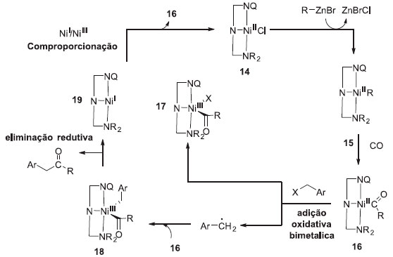Um mecanismo foi proposto para a reaçao (Esquema 4). O ciclo se inicia com a transmetalaçao do complexo de níquel 14, gerando o complexo alquílico de níquel(II) 15, o qual sofre inserçao de CO para obter o correspondente complexo acil de níquel(II) 16. A transferência de um único elétron (SET) do eletrófilo para o complexo 16 gera o complexo de níquel(III) 17 e um radical benzílico. A recombinaçao do radical com uma segunda espécie acil de níquel(II) 16, gera o formal complexo acil alquila de níquel(III) 18, o qual sofre eliminaçao redutiva, gerando o produto, enquanto forma espécies de níquel(I) 19. A comproporcionaçao com 17 gera os dois complexos de níquel(II) 14 e 16, que podem recomeçar o ciclo catalítico. Alguns experimentos foram ainda executados, suportando dessa forma o mecanismo proposto.