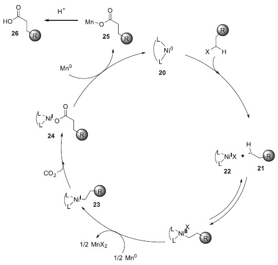 Reaçoes de carboxilaçao catalisadas por níquel Atualmente a comunidade química tem voltado suas atençoes para o desenvolvimento de metodologias sintéticas que envolvem o uso de CO2 devido ao impacto negativo gerado por esse gás ao ambiente. O CO2 é um reagente ideal pois é relativamente atóxico e infinitamente abundante. O grande desafio para o uso de dióxido de carbono é sua alta estabilidade cinética e termodinâmica. Porém, pesquisadores tem investigado métodos baseados na catálise de metais de transiçao para superar essas adversidades. O uso do níquel como catalisador nas reaçoes de carboxilaçao14, vem sendo explorados nos últimos anos por alguns grupos de pesquisa, como exemplo, o grupo de Martin15 e de Tsuji16.17 Um mecanismo geral para as reaçoes de carboxilaçao catalisadas por níquel pode ser proposto, mesmo que o uso de diferentes ligantes em cada sistema possa influenciar um pouco (Esquema 5). O ciclo catalítico inicia-se com a reduçao do complexo de Ni(II) a Ni(0) 20, seguido por uma transferência de um único elétron (SET) do haleto de alquila, para formar o transitório radical alquila 21 e espécies de haleto de Ni(I) 22. A recombinaçao e subsequente reduçao pelo manganês(0), produz a espécie reativa η1-Ni(I) 23, que sofre inserçao de CO2, gerando 24. A reduçao mais uma vez do manganês (0), permite o ciclo catalítico recomeçar e formar carboxilato de manganês 25, o qual é hidrolisado durante o término da reaçao, gerando o ácido carboxílico 26.18