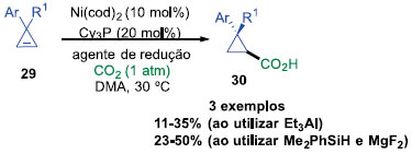Na literatura é possível encontrar protocolos para carboxilaçao de haletos primários, porém a extensao para secondários e terciários ainda é um desafio. Reaçoes em um anel tenso e no orbital reibridizado, como nos anéis de ciclopropilas podem facilitar a carboxilaçao de ciclopropil secundários, levando assim a um novo acesso a ácidos ciclopropil carboxílicos. Pensando nesse desafio, Martin e colaborados descreveram uma metodologia, utilizando condiçoes brandas na presença de CO2, a uma pressao atmosférica (Esquema 6). É a primeira carboxilaçao redutiva catalítica de haletos orgânicos secundários que podem ser conduzidos na ausência de componentes-π adjacentes. Curiosamente, diferentes perfis de estereosseletividades foram encontradas quando diferentes haletos ou ciclopropanos foram empregados. Os produtos foram obtidos com rendimentos que variaram entre 47 e 79%. Foi observado que a presença de substituinte aromático é imprescindível para a reaçao ocorrer. Todas as reaçoes assimétricas foram obtidas na forma de mistura cis/trans, sendo que o isômero majoritário continha a geometria trans. Foi observado ainda que a relaçao cis/trans obtida nos produtos nao se correlacionava bem com as do material de partida, sugerindo dessa forma, que o intermediário reagiria com radicais.18