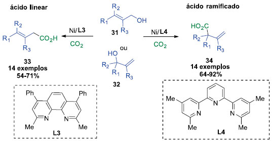 Pouco depois, o mesmo grupo investigou o estabelecimento de uma metodologia para promover a carboxilaçao de álcoois simples catalisada por níquel, na ausência de reagentes organometálicos em quantidades estequiométricas e sensíveis ao ar. Assim, foi discutida a hipótese de que CO2 poderia ter duas funçoes, como fonte de C1 e como um grupo de ativaçao para clivagem de ligaçao C-O (Esquema 8). A hipótese é sustentada pela habilidade do CO2 de reagir reversivelmente com álcoois para formar ácidos carboxílicos, diminuindo assim, a energia de ativaçao que promove a cisao C-O, enquanto aumenta a velocidade da adiçao oxidativa do [Ni0Ln] (Ln= ligante), anterior a inserçao de CO2. Dessa forma, os autores desenvolveram uma metodologia para a carboxilaçao de álcoois alílicos, catalisadas por níquel, sob pressao atmosférica. A metodologia foi analisada utilizando dois ligantes diferentes, L3 e L4. Foi observada uma peculiar seletividade, onde o ligante deveria ser utilizado de acordo com o substrato. Substratos ramificados funcionavam bem com o ligante L4 e os substratos lineares funcionavam bem com o ligante L3. A presença de C-O eletrofílicos, que poderia ser susceptível ao acoplamento cruzado por níquel, como aril metil ésteres e aril pivalatos nao competiram com a reaçao de carboxilaçao. Centros quaternários e terciários foram ainda acessados utilizado a metodologia. Os produtos foram obtidos com rendimentos que variaram entre 54 e 92%. Um produto natural foi sintetizado, a cognac lactona (Esquema 9), a fim de demonstrar a aplicabilidade da metodologia.19