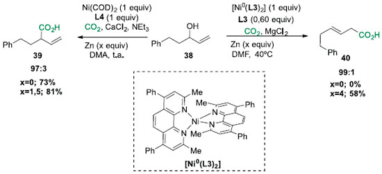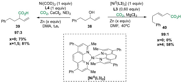 Visando entender a funçao do ligante, foram feitas algumas investigaçoes da reatividade das espécies de [Ni0Ln] (Esquema 10). Foi observado a falta de reatividade quando o álcool alílico 38 foi exposto a quantidades estequiométricas de [Ni0(L3)] ou [Ni(COD)2]/L4 na ausência de CO2, reforçando a ideia que a adiçao oxidativa do álcool para o [Ni0Ln] nao ocorre. Enquanto o [Ni0(L3)2] requer a presença de Zn na rota para formar 40, o correspondente [Ni(COD)2]/L4 produz o produto 39 na ausência do redutor. Os resultados sugerem que há uma intermediaçao do intermediário η1-NiI com o ligante bidentado rígido L3, levando a inserçao de CO2 no átomo de carbono α. Por outro lado, a presença do ligante tridentado L4 pode resultar em um intermediário η1-NiII, que levará a formaçao da ligaçao C-C no carbono γ.19