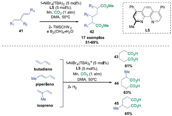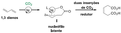 Recentemente, o grupo de Martin investigou a incorporaçao múltipla de moléculas de CO2 a 1,3-dienos catalisadas por níquel, uma rota elegante para a síntese de ácidos adípicos. Os múltiplos sítios de inserçao de CO2 poderiam ser controlados na ausência de fontes de hidreto pela exploraçao inerente da nucleofilicidade carbogênica de I, como demonstrada no Esquema 11. Sobre um equilíbrio π-σ, os ácidos adípicos podem ser obtidos por subsequentes incorporaçoes regiosseletivas de CO2 à I, que procede a uma reduçao para a recuperaçao de espécies do catalisador Ni(0)Ln. 20