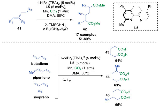 Após otimizar as condiçoes reacionais, a generalidade da reaçao de dicarboxilaçao foi investigada (Esquema 12). A proteçao in situ dos ácidos carboxílicos e a reduçao de alcenos foi necessária, sem a necessidade de purificaçao do ácido adípico resultante. Diversos produtos foram obtidos com rendimentos entre 51 e 89%. Butadienos, piperilenos e isoprenos também puderam ser utilizados, gerando produtos com rendimentos entre 61 e 65% e uma regiosseletividade que variou entre 93:7 e 77:23 (Esquema 13). 20